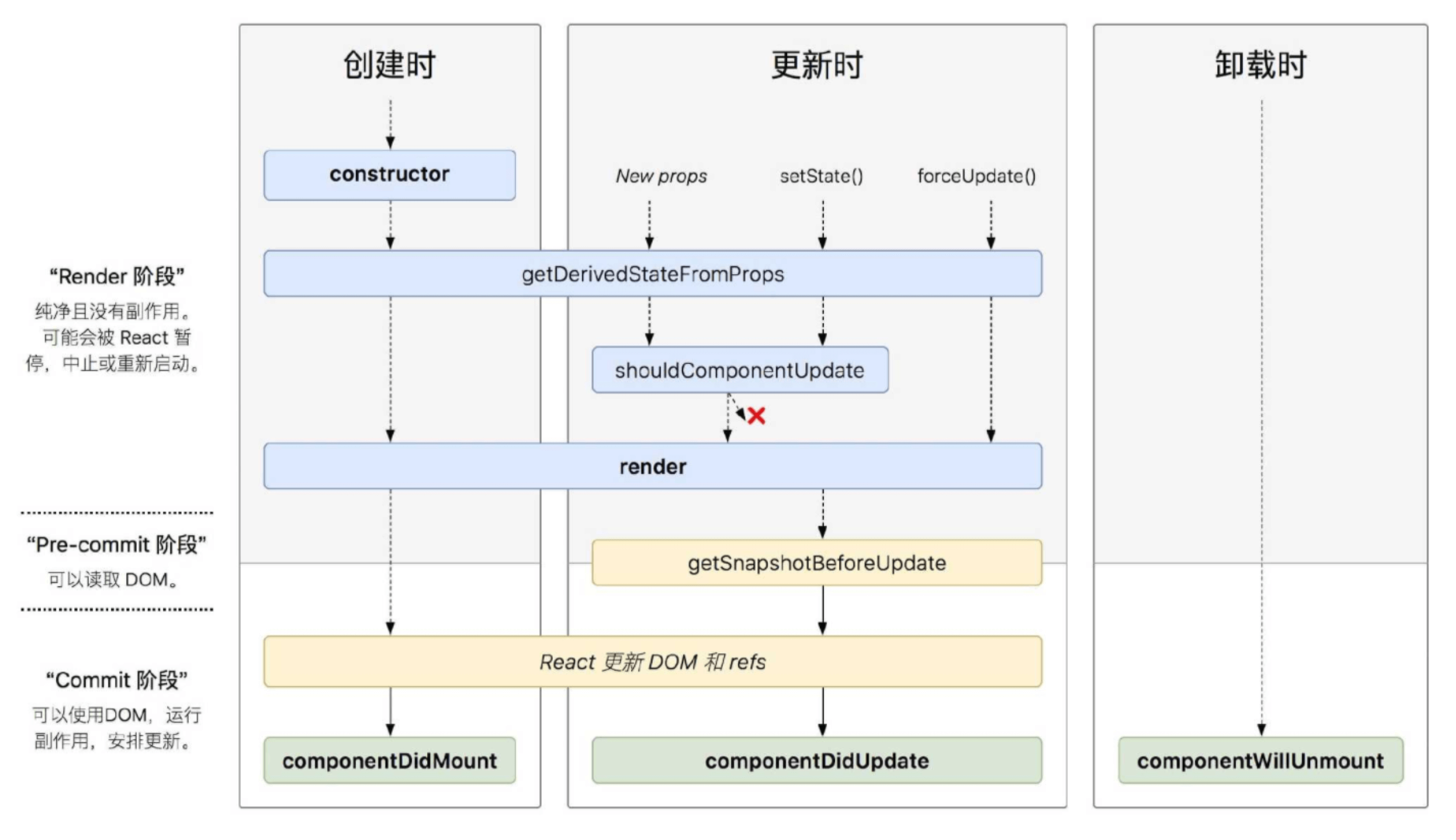 • getSnapshotBeforeUpdate 生命周期方法在更新之前(如:更新 DOM 之前)被调用。此生命周期的返回值将作为第三个参数传递给 componentDidUpdate。(通常不需要,但在重新渲染过程中手动保留滚动位置等情况下非常有用。)
